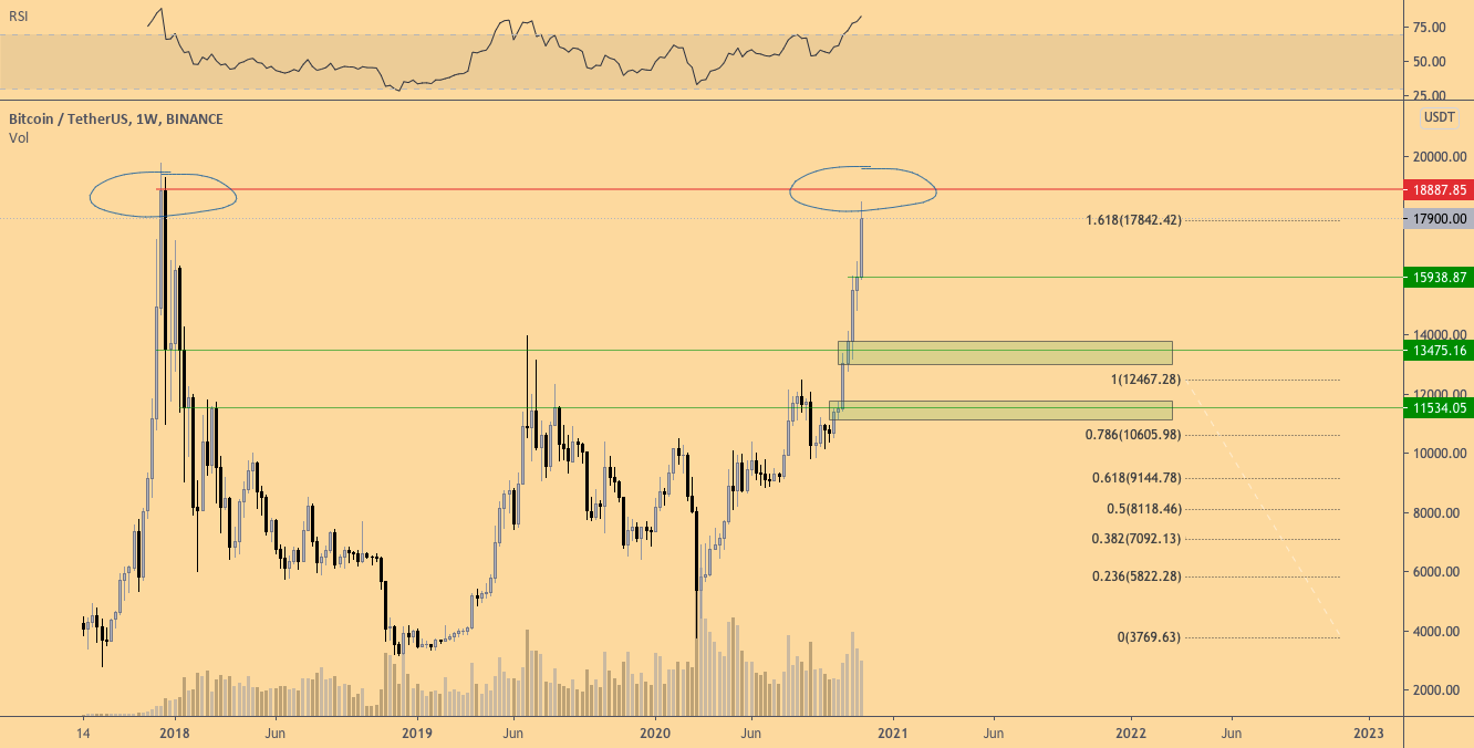 Есть несколько ключевых уровней, которым стоит уделить особое внимание в случае, если биткойн скорректируется до того, как взять $20.000. Первый потенциально интересный для трейдеров уровень можно обнаружить в районе $16.000. Следующие – около $13.500 и $11.600.