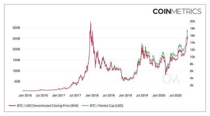 Что ж, по иронии судьбы нефтяные фьючерсы исследовали территорию отрицательных цен, Chuck E. Cheese обанкротилась, а биткойн все еще не достиг 0 $. Наоборот, он вернулся с удвоенной силой. Теперь мы штурмуем 18.000 $, и многие уже начали обратный отсчет до установления новых исторических максимумов. Веха, которой они ждут – это цена 20.000 $ за BTC, но я не уверен что это лучший способ оценки исторических максимумов.