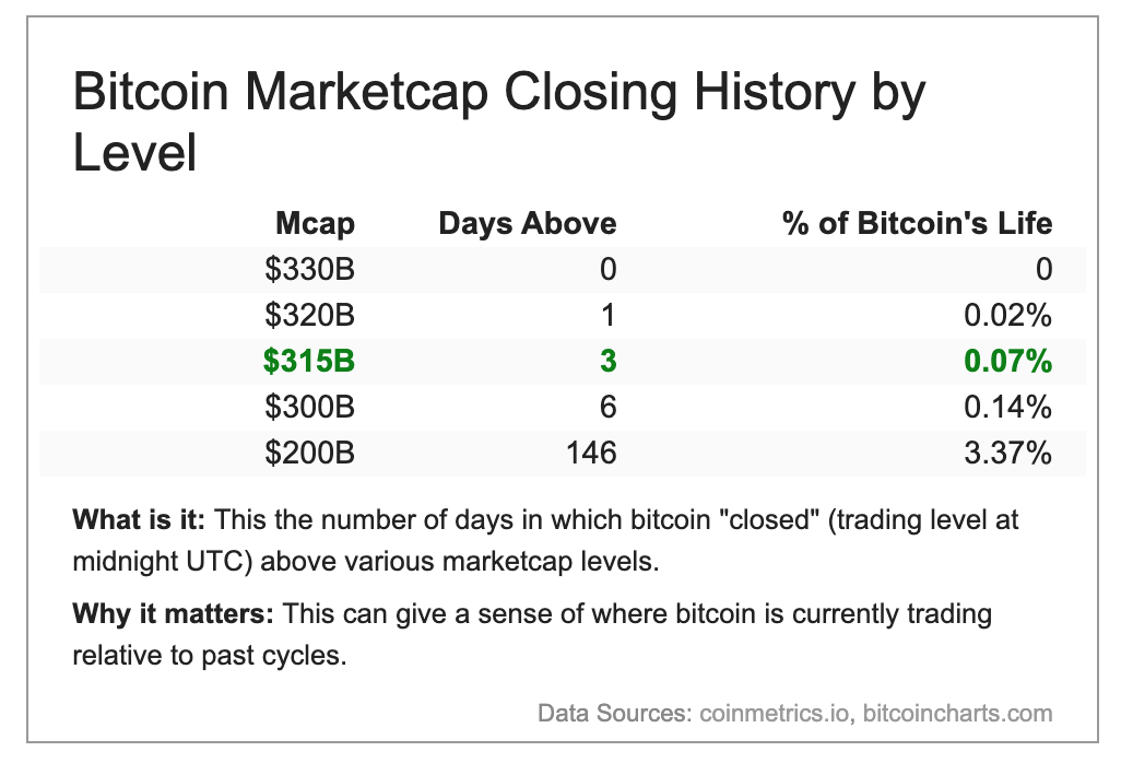 Это важно, потому что я считаю, что метрика рыночной капитализации гораздо важнее, чем цена за один биткойн. Денежная масса Биткойна постепенно растет, поэтому рыночная капитализация лучше отражает положение рынка. Сейчас, когда я готовлю этот пост, капитализация Биткойна составляет чуть больше 330 миллиардов долларов и уже находится на уровне предыдущего исторического максимума.