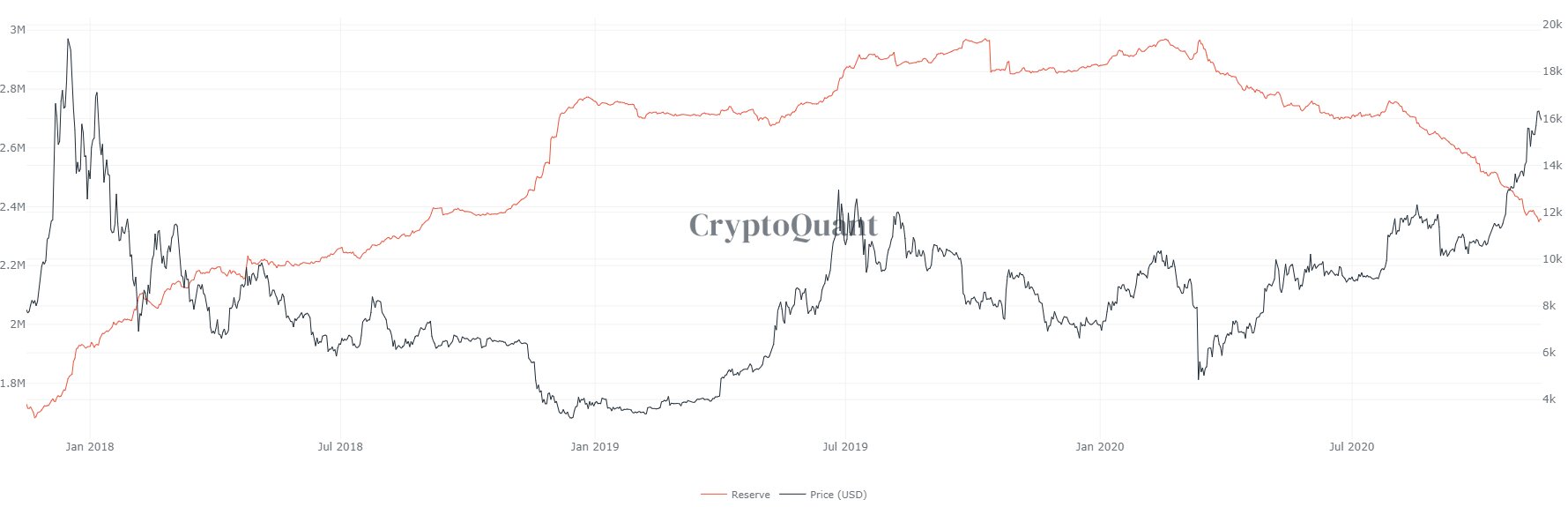 Резервы бирж в биткойнах за прошедший месяц сократились с 2,5 миллиона до 2,355 миллиона. С 15 октября по 15 ноября с бирж было выведено около 145.000 BTC общей стоимостью порядка 2,3 миллиарда долларов (при цене BTC 16.200 $ на 15 ноября).