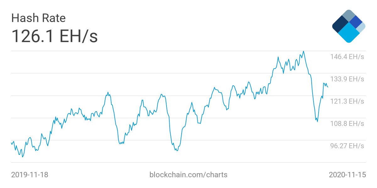 Семидневная скользящая средняя хешрейта Биткойна в период с 3 по 15 ноября восстановилась со 106 до 126 миллионов терахеш в секунду (Тхеш/сек).