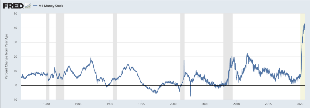 Денежная масса M1 в долларах США, изменение из года в год. Источник: FRED