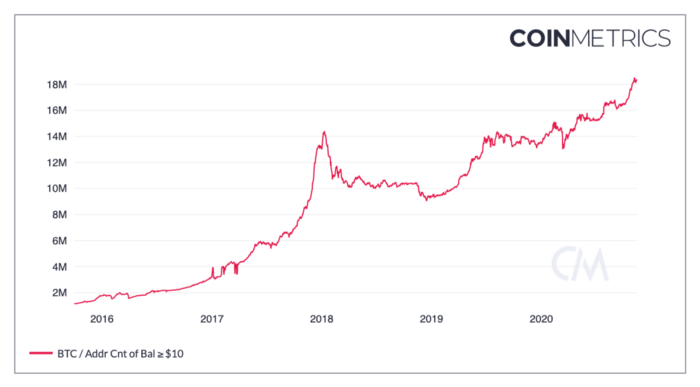Этот первый график представляет собой фундаментальный драйвер цены биткойна — принятие. Проще говоря, сегодня биткойнами владеет больше людей, чем в 2017 году, причём изрядно больше.