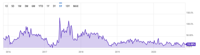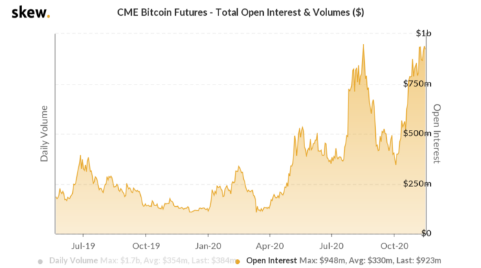 Этот продукт был первоначально представлен рынку 17 декабря 2017 года, в тот самый момент, когда цена находилась на самой вершине последнего бычьего ралли биткойна. На графике отсутствуют данные до середины 2019 года, но если взглянуть на обзор исторических данных биткойн-продукта от CME, то становится очевидным, что сумма открытых позиций действительно находится на уровне исторического максимума (хорошо, на самом деле всего лишь чуть ниже, чем значение ATH, установленное в августе 2020 года).