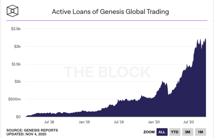 Для иллюстрации динамики роста кредитования предлагается множество графиков, но выдающееся кредитное портфолио Genesis, крупнейшего кредитора, ориентирующегося на работу с институциональными клиентами, наглядно освещает сложившуюся ситуацию.