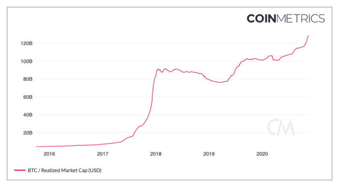 Реализованная капитализация сегодня составляет $129 млрд, что значительно выше её пикового значения в $90 млрд в начале 2018 года. Это говорит нам о том, что биткойн значительно более ликвиден на этих уровнях, а инвесторы менее заинтересованы в продаже. В конце 2017 / начале 2018 года цена за единицу биткойна была выше (справочная ставка Coin Metrics указывает наивысшую дневную цену закрытия в 00:00 UTC на уровне 19640 долларов США на 16 декабря 2017 года), однако активной торговли отнюдь не наблюдалось на таких головокружительно высоких уровнях. Это также объясняет стремительное обрушение биткойна с тех уровней. Он просто не мог быть устойчивым, поскольку в совокупности для инвесторов затратный базис был намного ниже этого порогового уровня, и они стремились получить прибыль. Бычье ралли 2017 года было скорее «плавкой» (от англ. melt-up — резкий подъём рынка, часто предшествующий обвалу), что было вызвано ICO, освещением в прессе и ажиотажем розничных инвесторов. На этот раз бычье ралли биткойна больше похоже на устойчивое медленное горение.