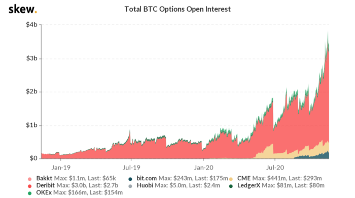 Открытый интерес в отношении опционного контракта суммирует стоимость непогашенных, неиспользованных опционов. (Трейдеры, торгующие опционами, будут брюзжать по поводу данной методологии только потому, что она может быть склонна к перекосам при торговле опционами по бессмысленным страйковым котировкам вроде $32 000). Хотя в абсолютном выражении цифры по-прежнему довольно низкие, зарождающийся, но созревающий рынок опционов говорит нам кое-что о состоянии биткойна на сегодняшний день.