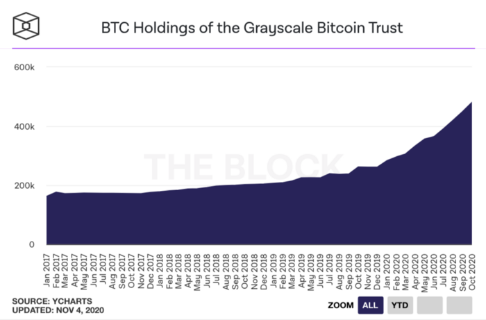 Одним из важнейших показателей, свидетельствующих об энтузиазме в отношении биткойна, является количество единиц этой криптовалюты, находящихся в распоряжении компании-менеджера активов Grayscale Investment. На момент написания статьи эта цифра превышала 500 тысяч BTC, что делало GBTC самой популярной финансиализированной версией биткойна.