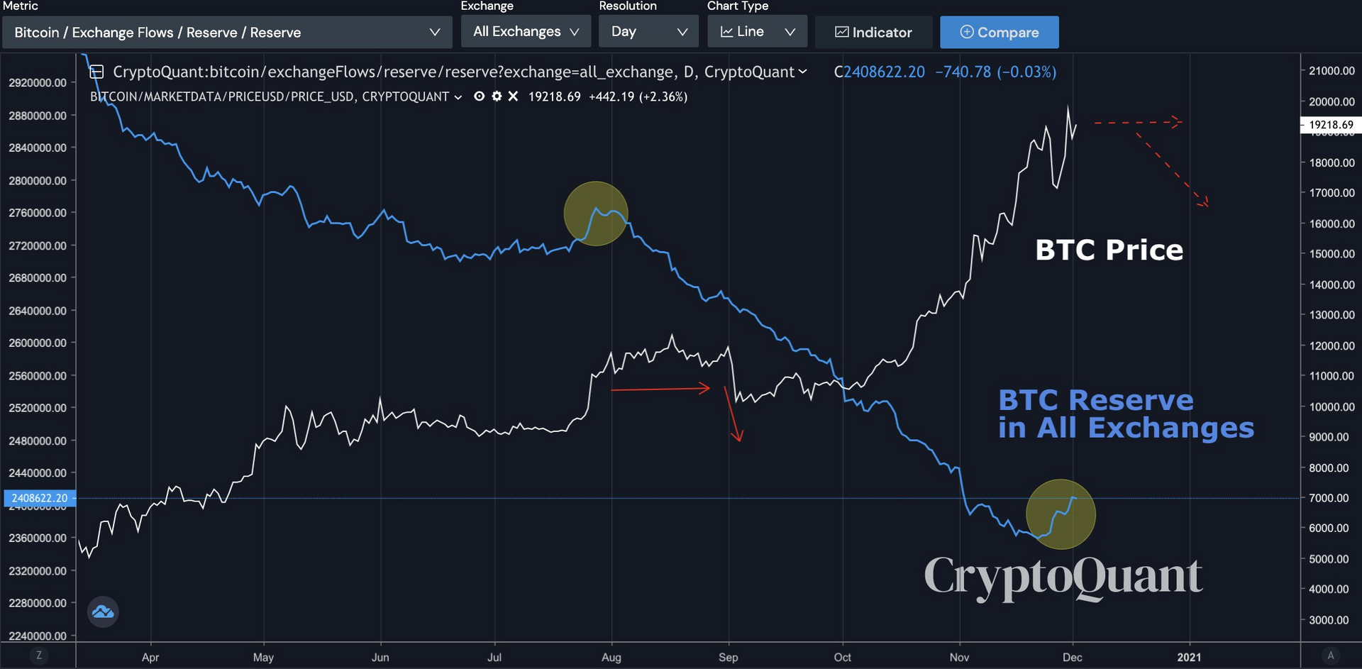 Четвертая причина: количество биткойнов на биржевых кошельках — биржевые резервы — больше не сокращается. Этот рост биржевых резервов напоминает то, что происходило в августе, когда цена BTC превысила $10.000. После пробоя $10.000 цена консолидировалась около месяца, прежде чем упасть примерно на $1000. После этого биткойн быстро восстановился и продолжил рост. Вполне вероятно, что и в этот раз биткойн может консолидироваться в течение длительного периода или упасть, чтобы найти дно перед отскоком.