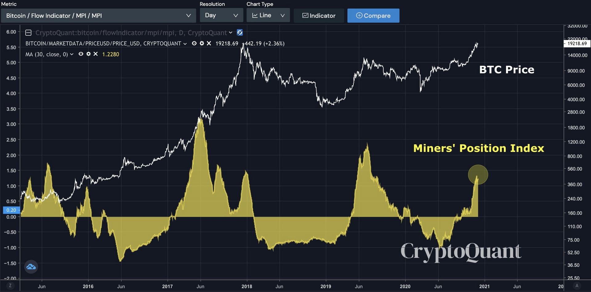 Третья причина заключается в том, что майнеры, до того не проявлявшие существенной активности, начали продавать свои биткойны. Индекс позиций майнеров (Miner’s Position Index, MPI), остававшийся отрицательным большую часть года, недавно достиг 1,5, нового рекордного значения для этого года. Судя по историческим данным, это не настолько высокое значение, чтобы дать повод ожидать завершения бычьего рынка, однако этого может быть достаточно, чтобы на какое-то время его остудить.