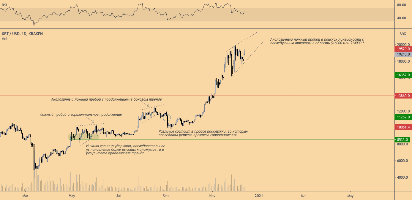 С другой стороны необходимо удержать область $18.500–18.600, чтобы подготовить почву для тестирования новых максимумов. Если этого не произойдет, то перспектива ретестов $16.000 и даже $14.000 будет по-прежнему актуальной.