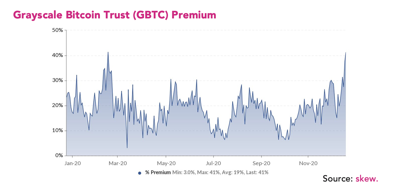 В краткосрочной перспективе неопределенной переменной в ценовом цикле биткойна будет Grayscale. По данным Skew, премия Grayscale Bitcoin Trust достигла 41% к рынку, то есть инвесторы покупают биткойн через Grayscale на 41% выше спотовой цены BTC.