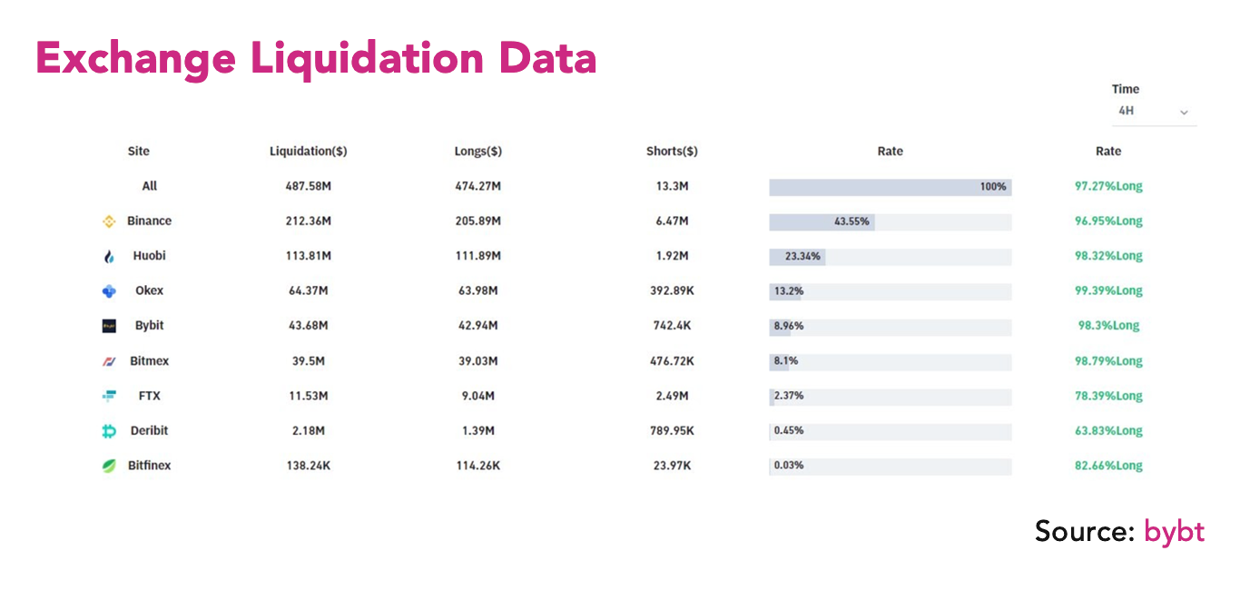 Однако, вместо небольшого пуллбэка, в последующие 17 часов цена BTC упала до 21 815 $. Это резкое 10% падение стало следствием каскадных ликвидаций на крупнейших фьючерсных биржах, включая Binance, OKEx и Huobi.