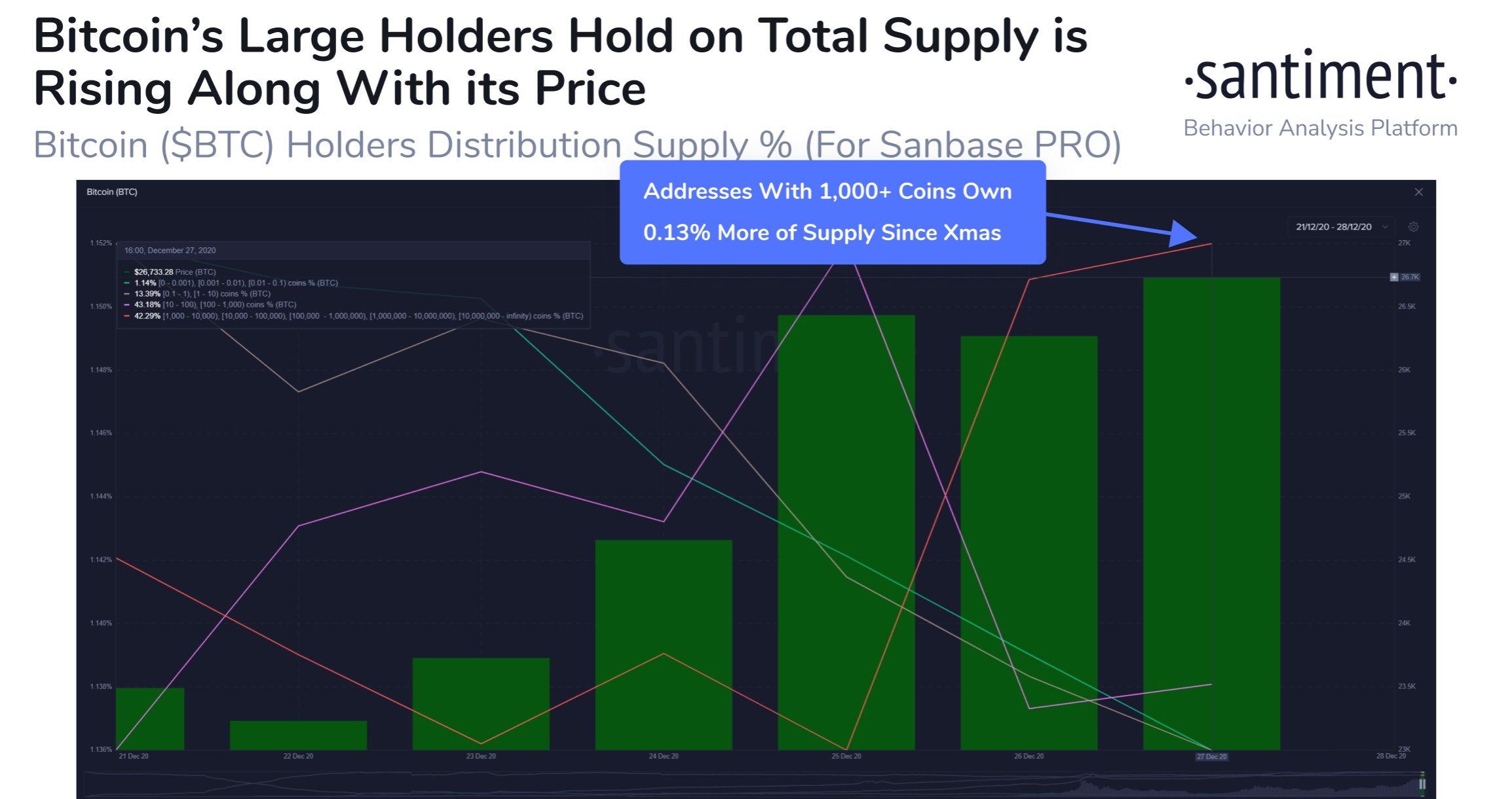 За прошедшие с Рождества 48 часов адреса с балансом 1000+ BTC увеличили свою долю в общем предложении биткойнов на 0,13%. Это примерно 24 158 токенов, что на текущий момент эквивалентно 647,7 млн $.