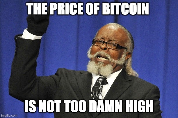 Поэтому, когда я вспоминаю о Джимми Макмиллане и его избирательной кампании, у меня велик соблазн провозгласить по аналогии с его мантрой собственный слоган денежного активиста: «Цена биткойна НЕ слишком чертовски высока!» Сейчас, когда цена BTC перевалила за 20 000 $, и главный вопрос, которым задаются новые потенциальные покупатели, — это «Не переоценен ли биткойн?», такое перепрофилирование мантры/мема Макмиллана представляется мне уместным более чем когда-либо.