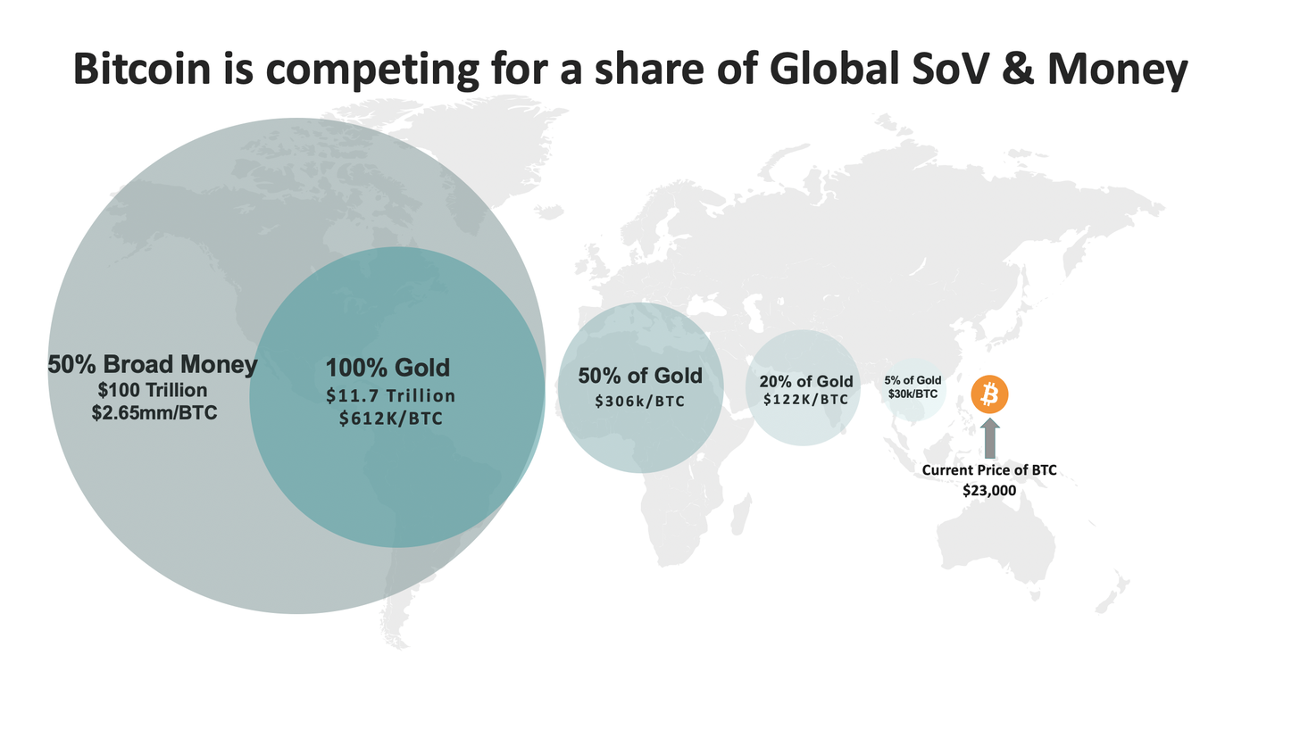 Как показано выше, текущая капитализация биткойна — это лишь малая часть объема рынков, за которые он конкурирует в мире, остро нуждающемся в твердых деньгах и активах-убежищах. Поэтому, глядя на цену биткойна, или когда услышите, как кто-то говорит «Это слишком дорого для биткойна», отступите на шаг и взгляните на общую картину того, где биткойн находится сегодня, и на объем глобальных рынков, за долю в которых он конкурирует. И это не просто торговая сделка, но постоянное распределение баланса в пользу нового типа денег — несуверенных, с фиксированным объемом предложения, децентрализованных и неизменных, — который имеет реальные шансы стать глобальным стандартом и мировой резервной валютой.