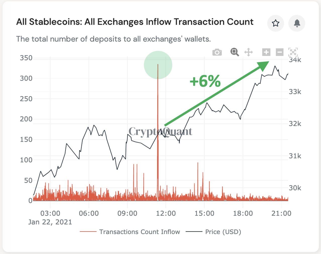 «Этот индикатор — один из самых мощных ончейн-сигналов. Он позволяет с довольно высокой точностью предугадывать краткосрочные волны роста вне зависимости от общего рыночного тренда. Речь идет о количестве новых депозитов в стейблкойнах на всех биржах. Это показывает, сколько инвесторов направляют стейблкойны на биржи для покупки криптоактивов. Например, если это значение достигло 80, то можно предположить, что в одном блоке, за 15 секунд, 80 человек переводят средства на биржевой кошелек».