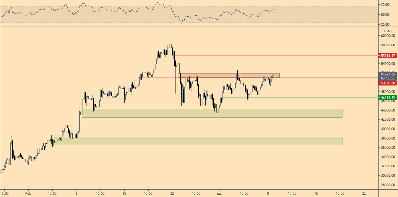 Для биткойна важнее успешно обратить уровень $52 тыс. в поддержку, нежели просто пробиться выше этого барьера, как это было 3 марта, прежде чем цена снова откатилась назад.
