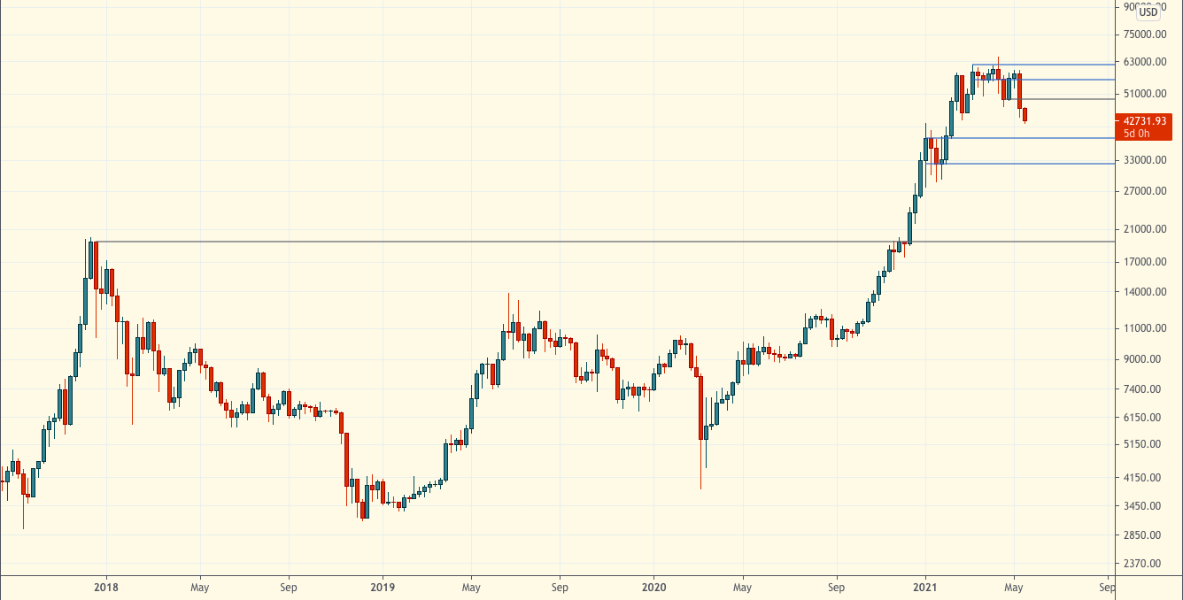 Соответственно, с нашей точки зрения, имеет смысл выкупать либо падение до $32,2–38,2 тыс., либо силу (успешный прорыв сопротивления $49,1 тыс.). Для более краткосрочных трейдеров, нижняя граница диапазона на дневном таймфрейме ($44,9–46,5 тыс.), вероятно, станет определяющей для того, какой из обозначенных выше уровней будет достигнут первым.