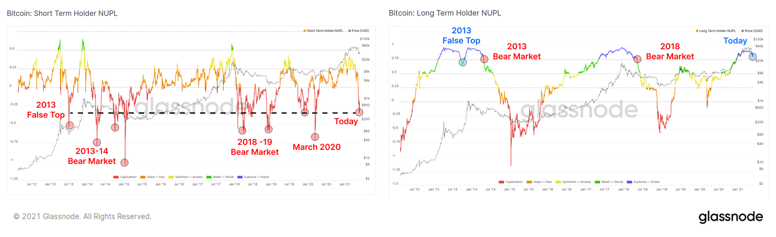 В последней аналитической статье мы обсуждали чистую нереализованную прибыль/убыток для обеих групп, чтобы определить их относительные болевые точки. По нашей оценке, краткосрочные владельцы капитулировали большим объемом монет, однако они еще могут оставаться источником предложения на стороне продажи в ближайшем будущем. Долгосрочные владельцы, с другой стороны, остаются в прибыли, однако приближаются к пороговому уровню чистой нереализованной прибыли/убытка (NUPL) в 0,75. В предыдущих циклах это сигнализировало о начале медвежьих рынков, поскольку долгосрочные владельцы фиксировали оставшиеся нереализованными прибыли.