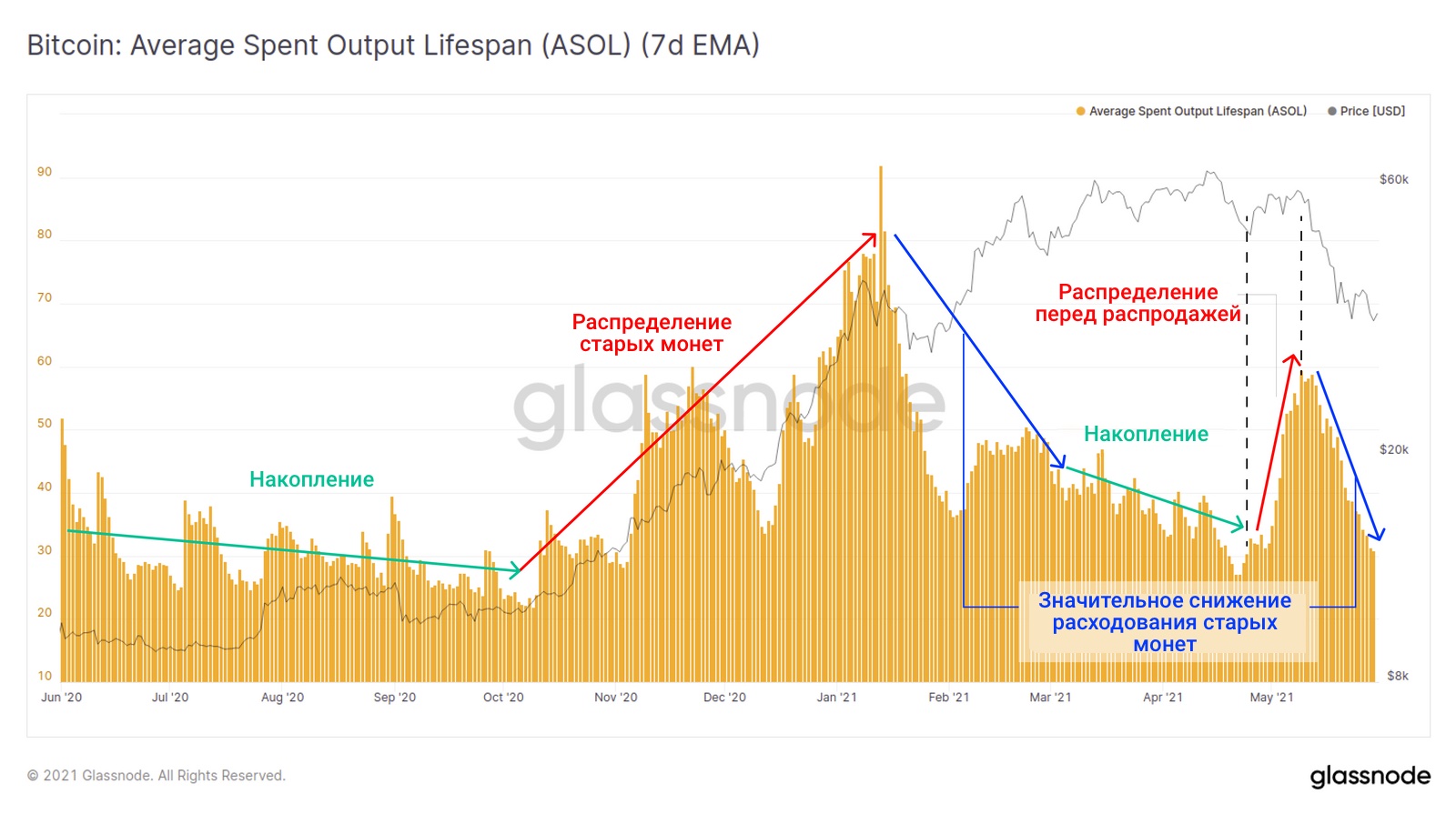 - Высокие значения ASOL означают, что старые монеты находятся в движении и распределяются по новым адресам.