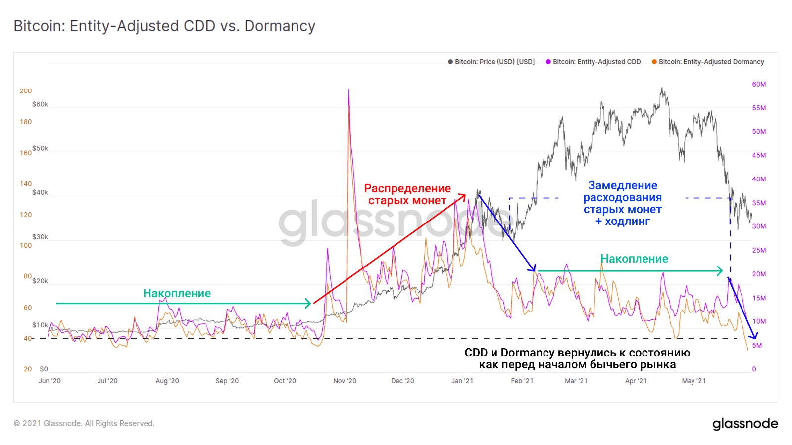 Другие две метрики срока жизни, Coin-Days Destroyed (койн-дней разрушено), или CDD, и Dormancy (время бездействия монет), рисуют аналогичную картину. Старые монеты, по-видимому, остаются практически без движения (низкие значения указанных метрик), несмотря на 50% падение цены от пиковых значений.