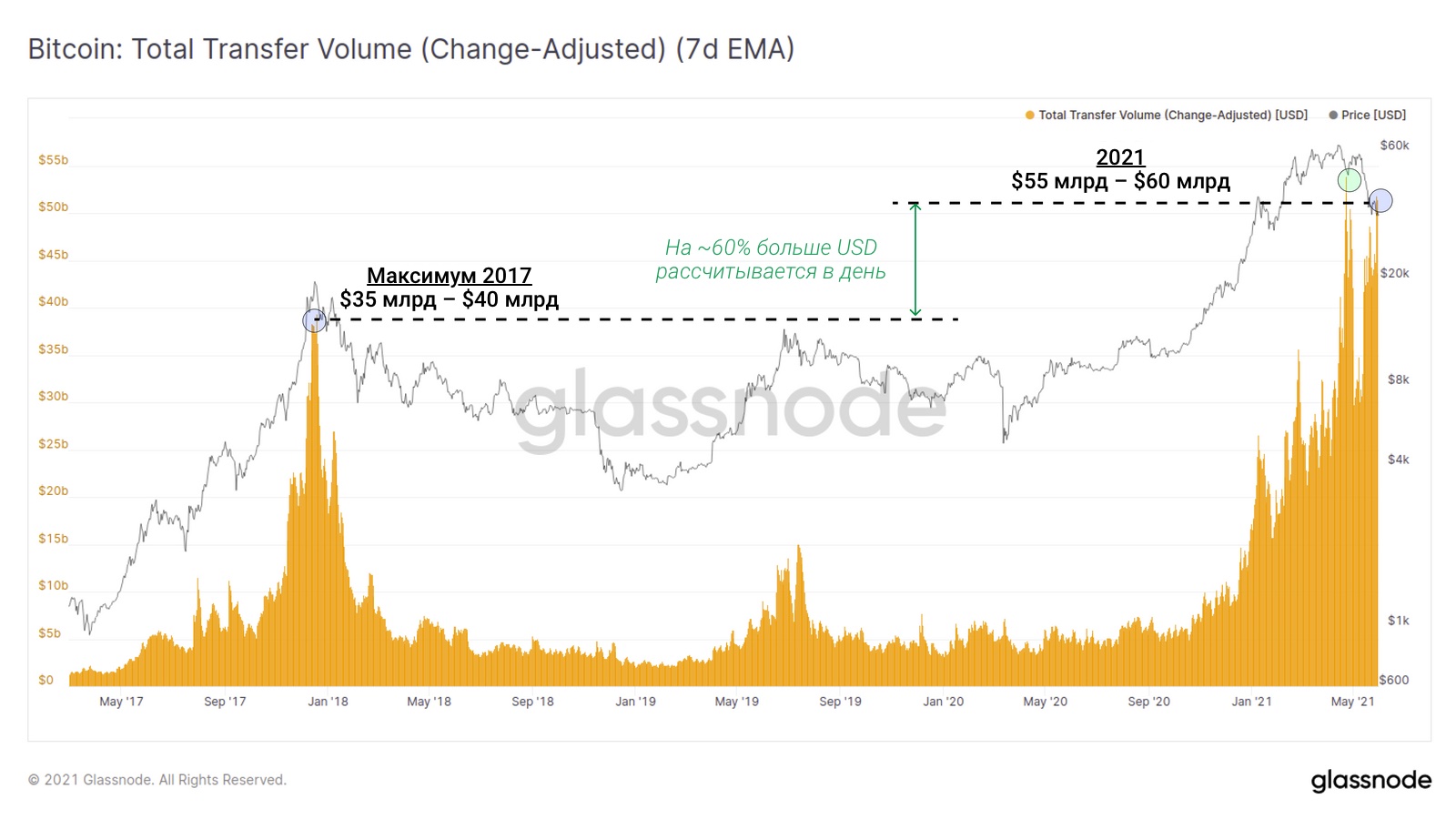 Общий объем ончейн-расчетов в долларовом выражении (до 55 млрд $/сутки) на прошлой неделе также очень близок к рекордному максимуму. Это на 60% больше, чем на пике 2017 года. Так что нельзя отрицать, что в движении находится огромное количество монет.