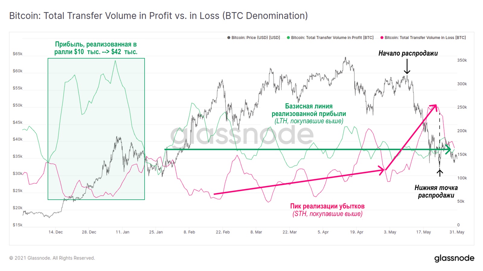Мы можем рассмотреть также объем ончейн-трансфера BTC, продаваемых с прибылью (купленных по меньшим ценам), в сравнении с объемом BTC, продаваемых в убыток (купленных по более высоким ценам). Из графика ниже можно сделать несколько ключевых наблюдений, которые в значительной мере подтверждают, что большая часть расходования и давления продаж на сегодняшний день исходит от краткосрочных владельцев: