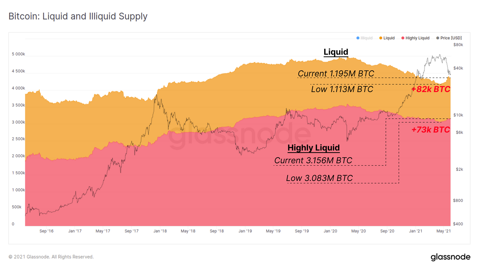 Метрика ликвидного и неликвидного предложения показывает, что за май из неликвидного состояния (ходлинг) в ликвидное или высоколиквидное перешли в общей сложности ₿155 тыс., что позволяет оценить общее «давление продаж». Эта метрика учитывает как долгосрочных, так и краткосрочных владельцев, которые тратили монеты, ранее хранившиеся на кошельках с эвристикой, похожей на холодное хранение.