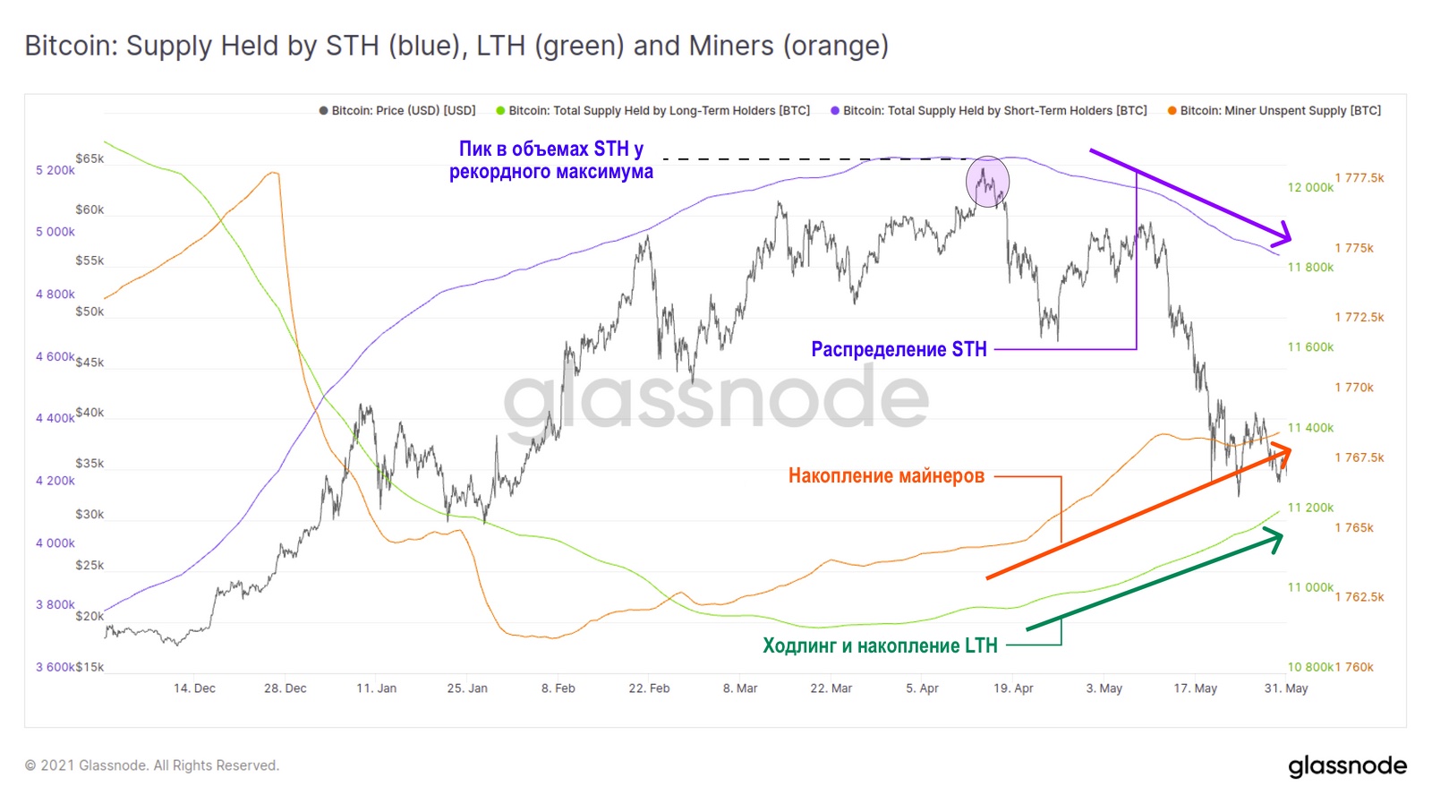Наконец, мы можем сравнить объемы предложения, удерживаемые краткосрочными (синяя кривая), долгосрочными (зеленая) держателями и майнерами (оранжевая).