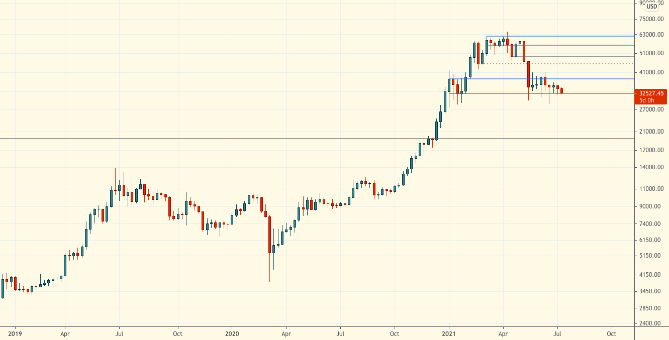 Вы можете сформулировать убедительный тезис о том, что срочное сокращение рисков со стороны Китая подходит к концу, и продажи были выкуплены опытными игроками рынка у $30 тыс. У продавцов, так сказать, заканчиваются монеты. Рынок предпринял несколько попыток продолжить нисходящий импульс, включая дневные закрытия ниже $30 тыс., но на недельном таймфрейме поддержка сохранялась, несмотря на шквал негативных новостей из области регулирования в различных юрисдикциях. Попытка медведей провалилась. Теперь только вверх!