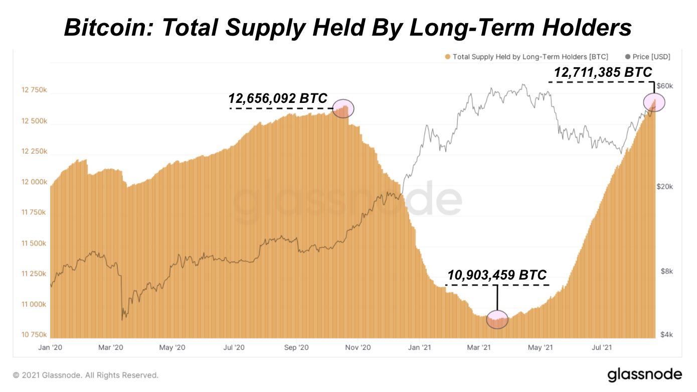 Девятнадцатого октября 2020 года общий объём предложения в руках долгосрочных держателей достиг рекордного уровня в ₿12 656 092, после чего постепенно снижался по мере притока в актив нового капитала.