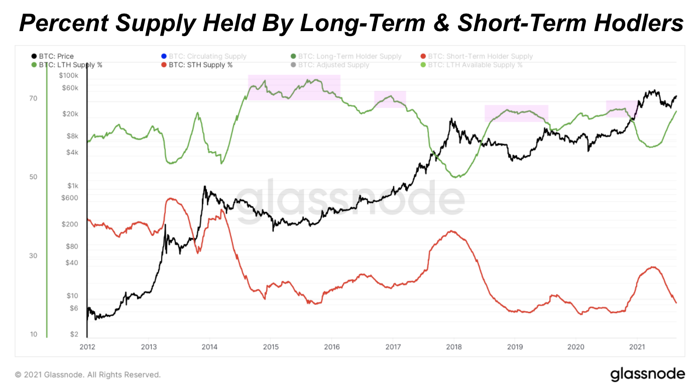 На самом деле исторические данные за более или менее недавний период обнаруживают довольно сильную корреляцию между накоплением со стороны долгосрочных владельцев и медвежьим ценовым трендом. Подразумевает ли сегодняшнее положение вещей медвежий сигнал или, может быть, это значит что, несмотря на 70-процентное ралли в последние 35 дней, «умные деньги» лихорадочно аккумулируют BTC, предчувствуя, что должно произойти?