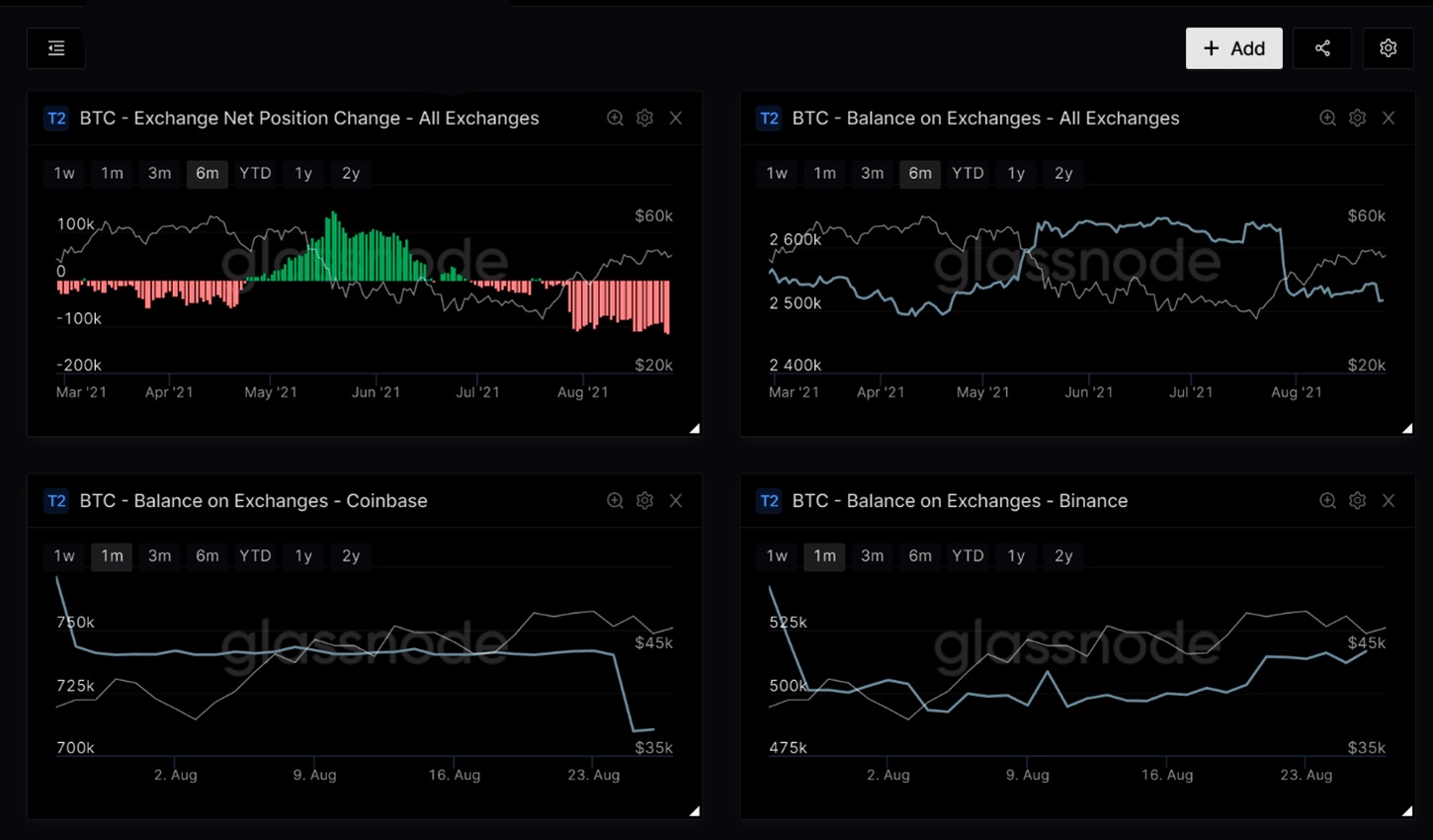 Изменение чистой позиции бирж (все биржи), биржевые балансы (все биржи), биржевые балансы (Coinbase), биржевые балансы (Binance)