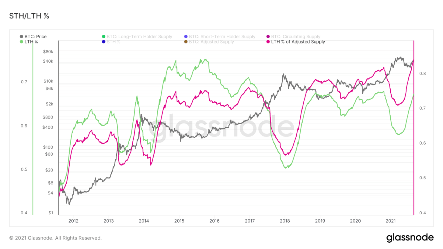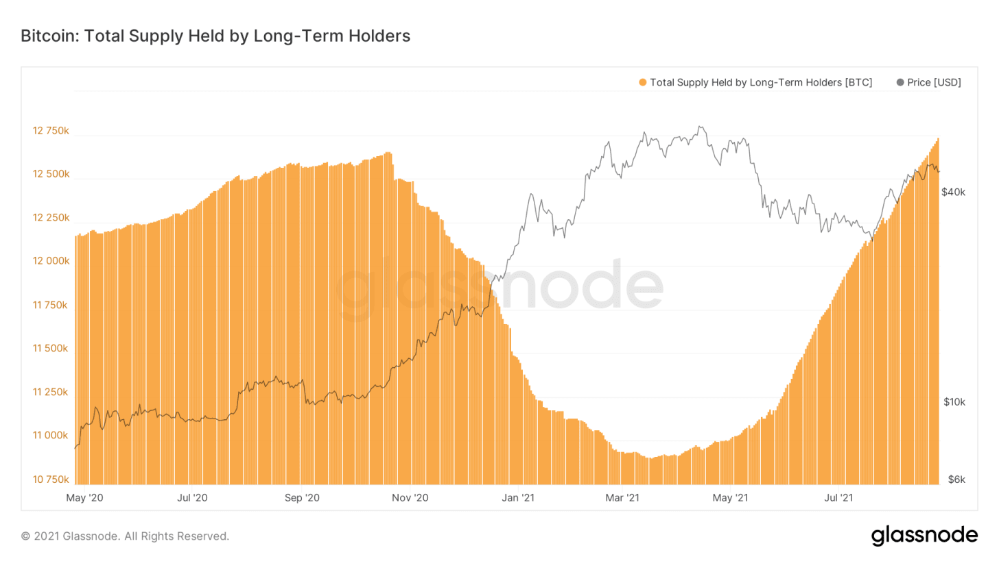 Отчасти это связано с уверенностью долгосрочных инвесторов, продолжающих неустанно покупать BTC, отчасти с созреванием UTXO, переходящих через условный 155-дневный порог, разделяющий группы краткосрочных и долгосрочных держателей.