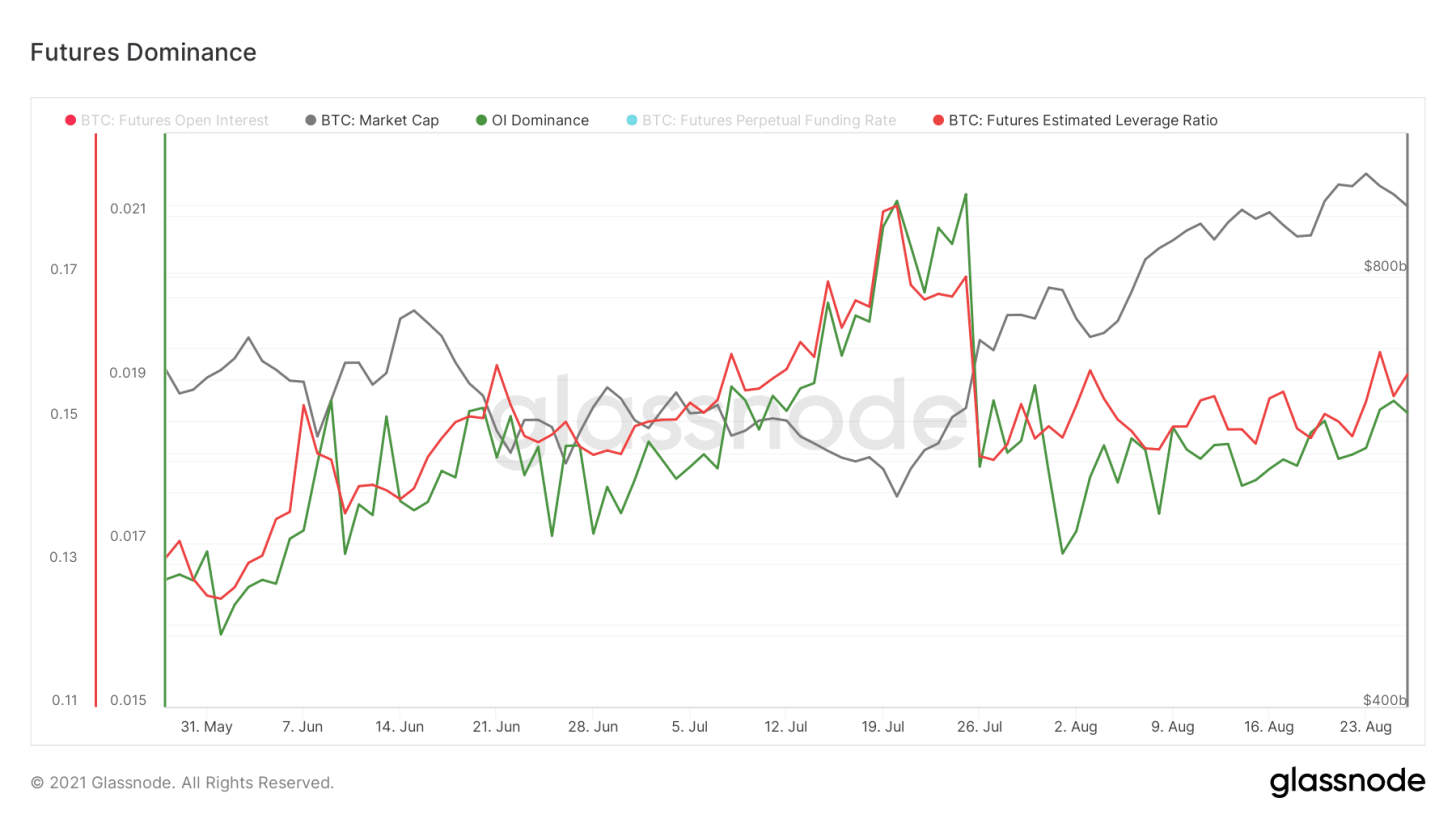 Логика, лежащая в основе таких прогнозов, понятна, однако она не принимает во внимание тот факт, что открытый интерес к фьючерсам по сравнению с рыночной капитализацией Биткойна сейчас невелик, о чем свидетельствует коэффициент доминирования открытого интереса OI Dominance Ratio. Уровень левериджа в объеме открытого интереса тоже сравнительно невелик, о чем свидетельствует Коэффициент расчетного кредитного плеча по фьючерсам на BTC.
