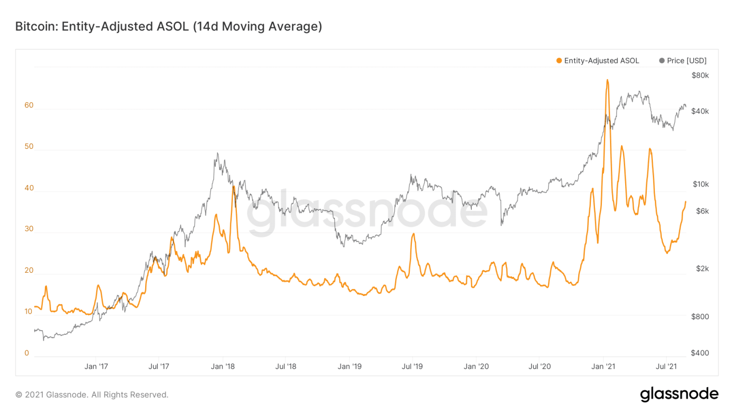 Как уже упоминалось, еще один способ взглянуть на эти процессы — через метрику Average Spent Output Lifespan (средний срок жизни потраченного выхода), в данном случае мы используем версию с поправкой на пользователей, Entity Adjusted ASOL.