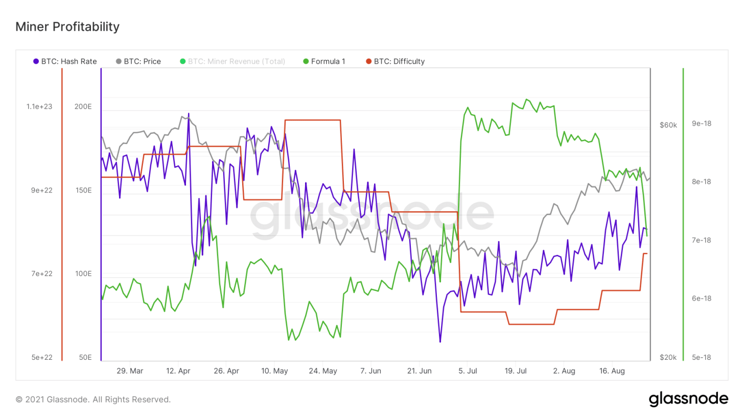 • Хеш-мощности продолжают возвращаться в сеть, сложность корректируется соответственно, как результат, прибыльность майнинга в BTC/хеш снижается.