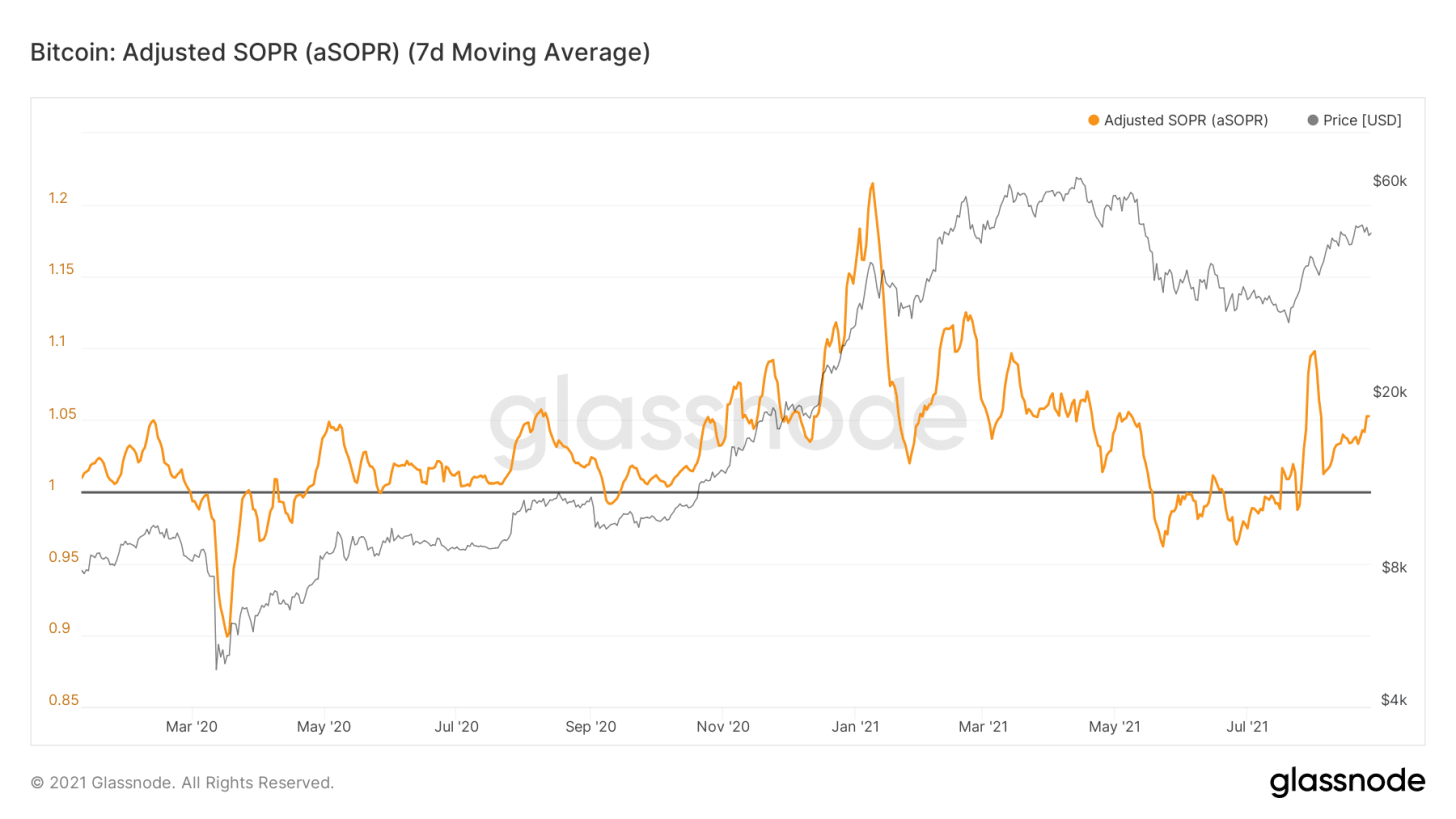 Положительный сигнал подает индикатор aSOPR, отслеживающий, с какой прибылью в среднем продаются монеты в каждый конкретный день. В недельной версии значение индикатора вернулось на «бычью» территорию выше уровня единицы. В дневной версии во время последней просадки курса BTC оно отскочило от 1, что является хорошим знаком. Это говорит о том, что участники рынка на сегодняшний день не желают продавать в убыток и в теории уважают текущий восходящий тренд.
