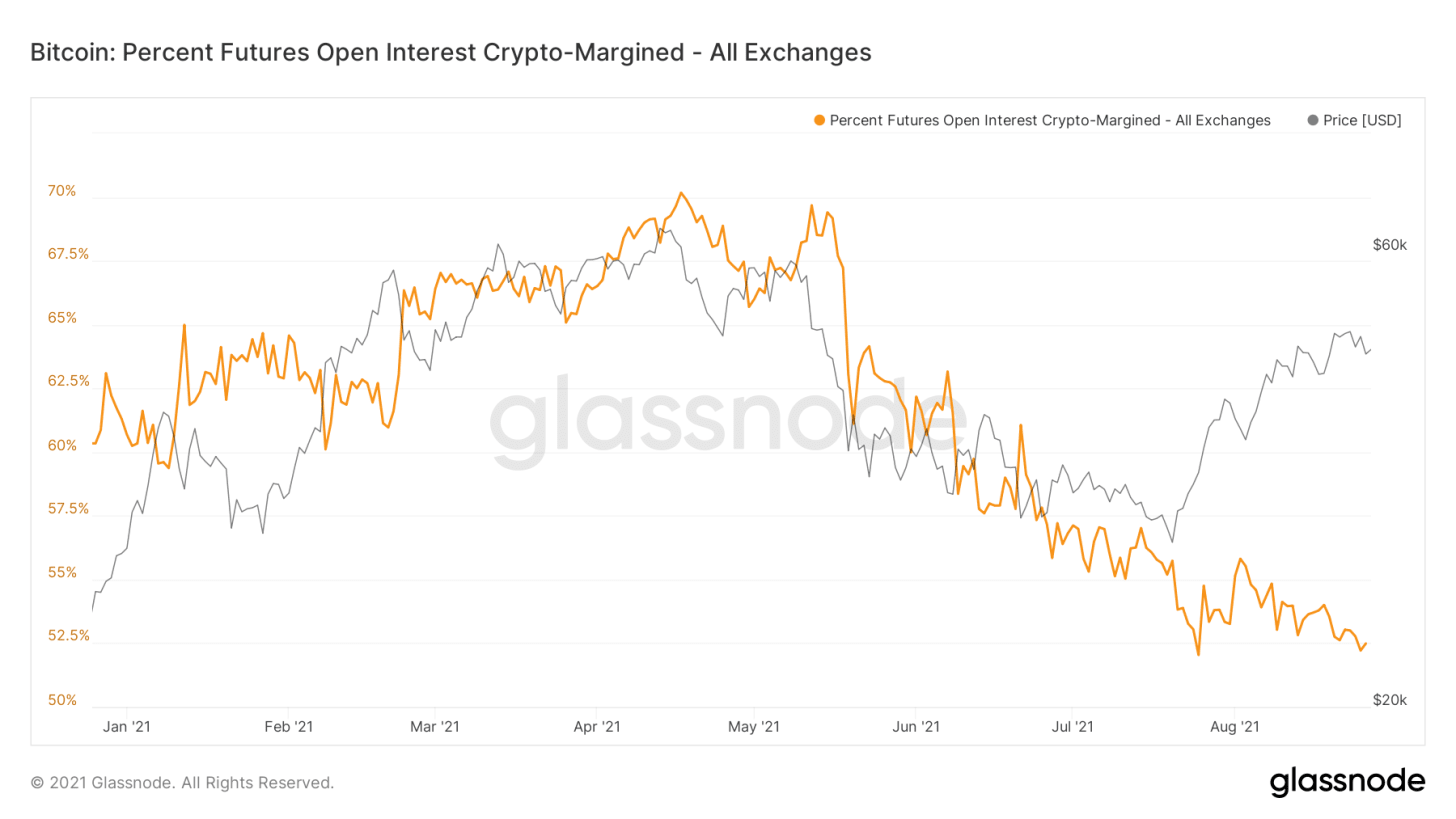 Что касается фьючерсов, то процент открытых позиций, маржируемых криптовалютами, продолжает снижаться. Рынок предпочитает фьючерсы, маржируемые стейблкойнами, но почему? Биткойн в качестве обеспечения рыночных позиций отлично подходит трейдерам, которые удерживают лонги на сильном бычьем рынке, поскольку стоимость их залога растет вместе с ценой актива, на который они делают ставку. Это добавляет огромную рефлексивность к рыночному росту.
