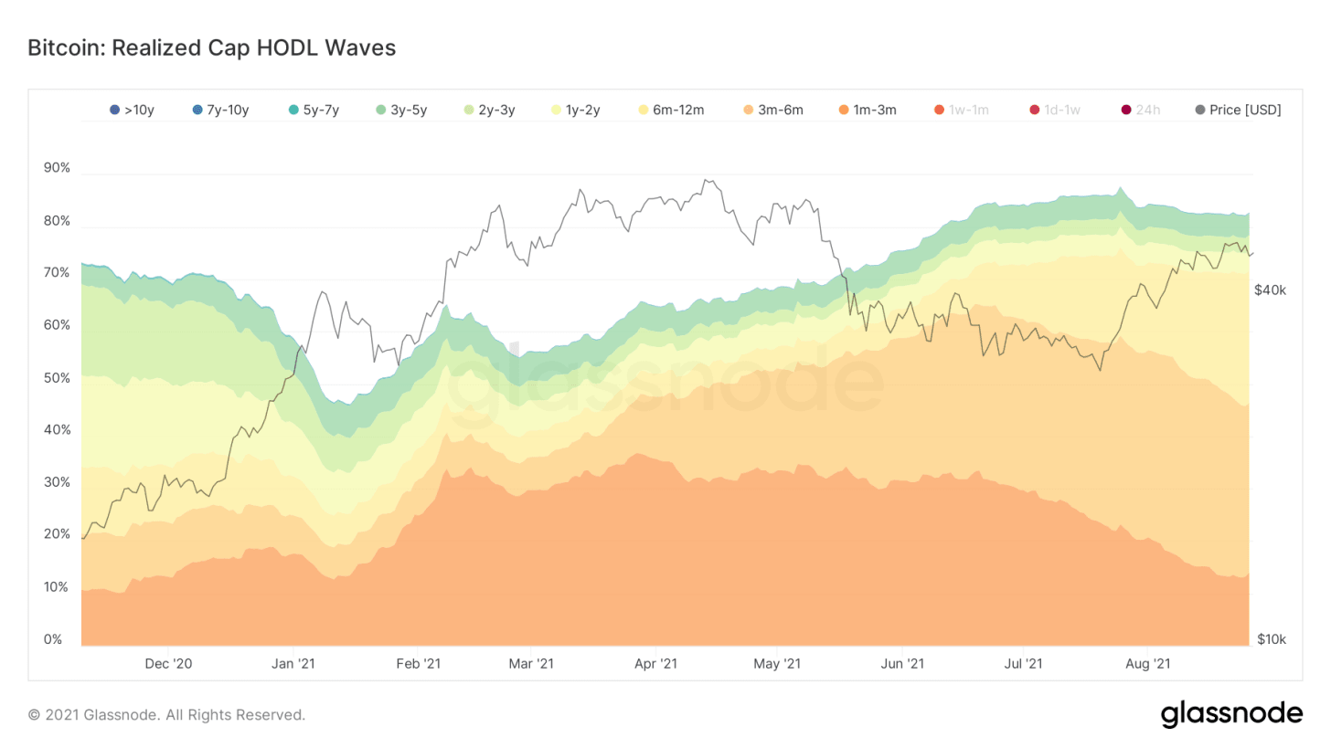Как показывает индикатор Realized Cap HODL Waves (HODL-волны, взвешенные по реализованной цене), мы наблюдаем действительно сильное созревание монет, купленных в течение последних нескольких месяцев.