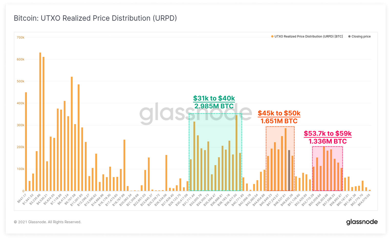 На диаграмме ниже показаны ценовые диапазоны, в которых в последний раз перемещались сопоставимые объемы предложения BTC. С момента взятия исторического максимума предыдущего цикла, $20 тыс., рынок сформировал три заметных кластера ончейн-объема.