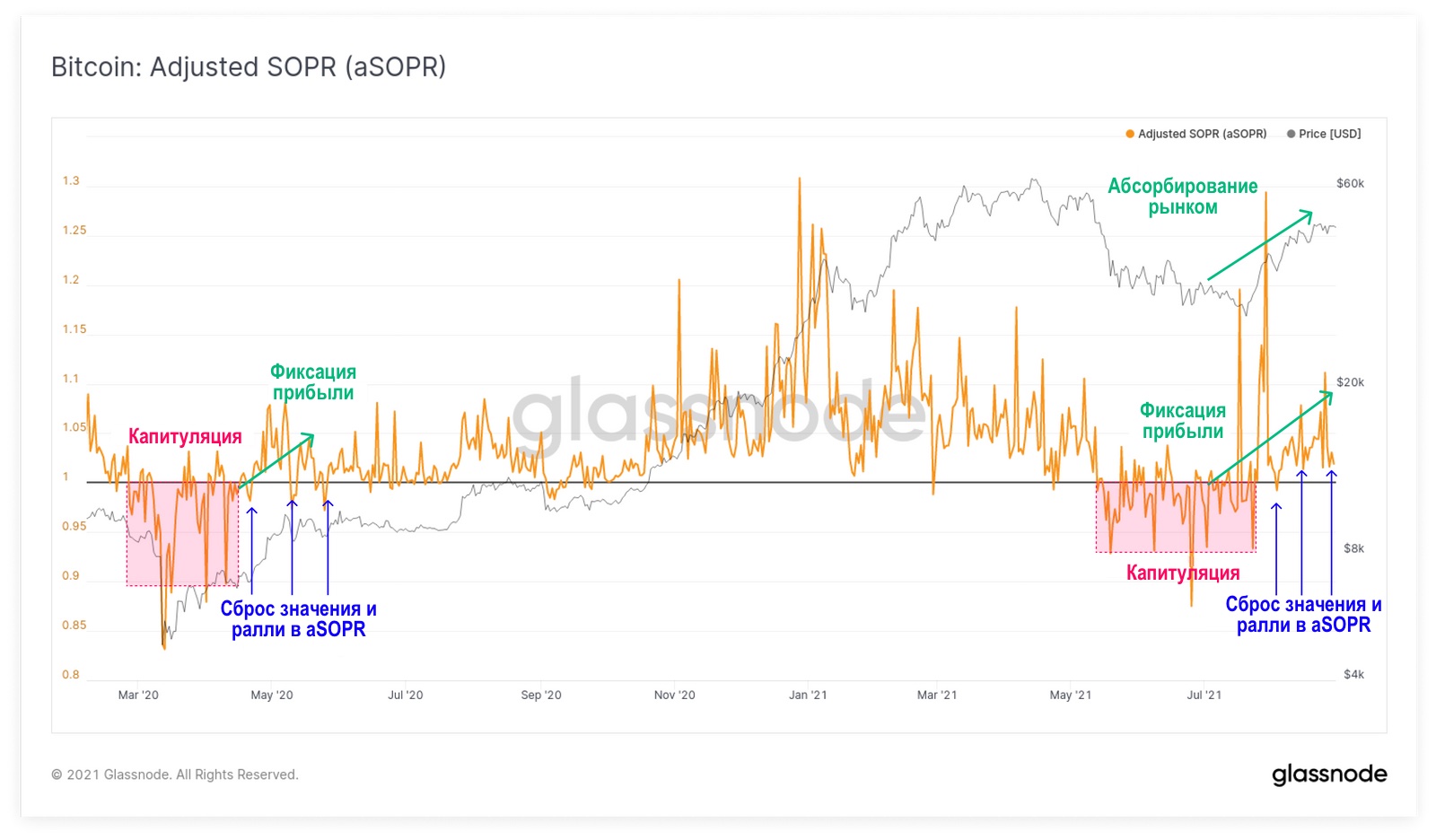 В этом контексте фиксация прибыли происходила в течение всего августа, по мере роста цены. Это косвенно свидетельствует о силе рынка, способного абсорбировать это предложение «монет». Метрика aSOPR (скорректированная версия коэффициента прибыльности потраченного выхода) показывает, что аналогичное поведение наблюдалось и после распродажи в марте 2020 года со следующей последовательностью событий: