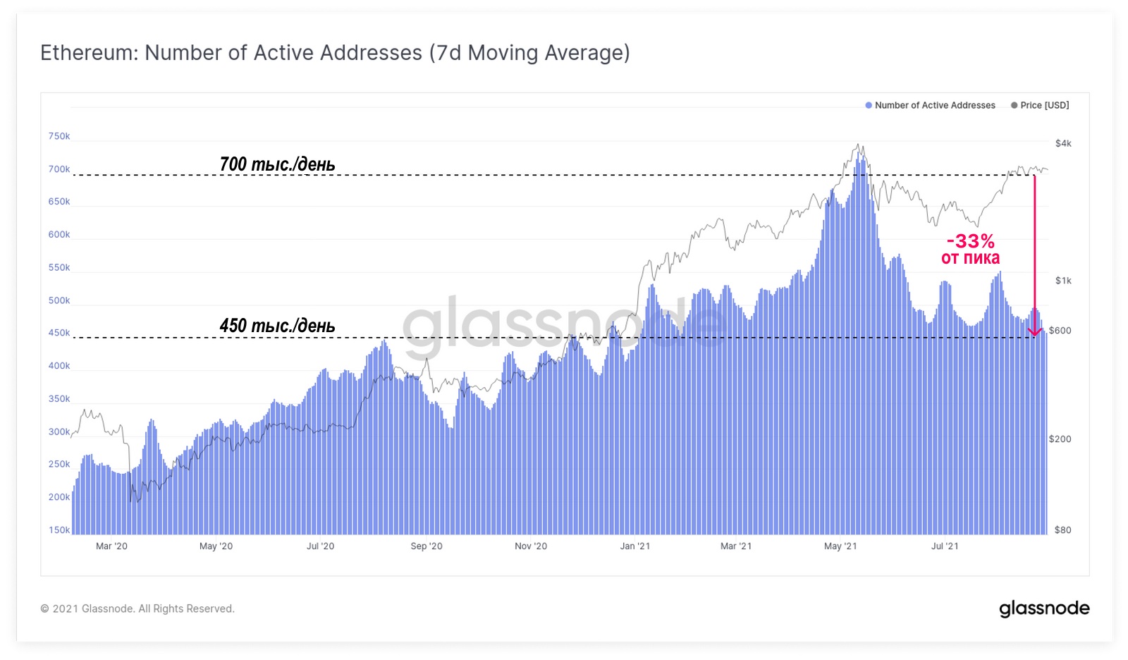 Число активных адресов в Ethereum тоже снизилось на 33% от майского пика и в настоящее время составляет 450 тысяч в сутки. Примечательно, что текущая активность в обоих блокчейнах аналогична той, что наблюдалась в стабильном диапазоне бычьего накопления в середине – второй половине 2020 года.