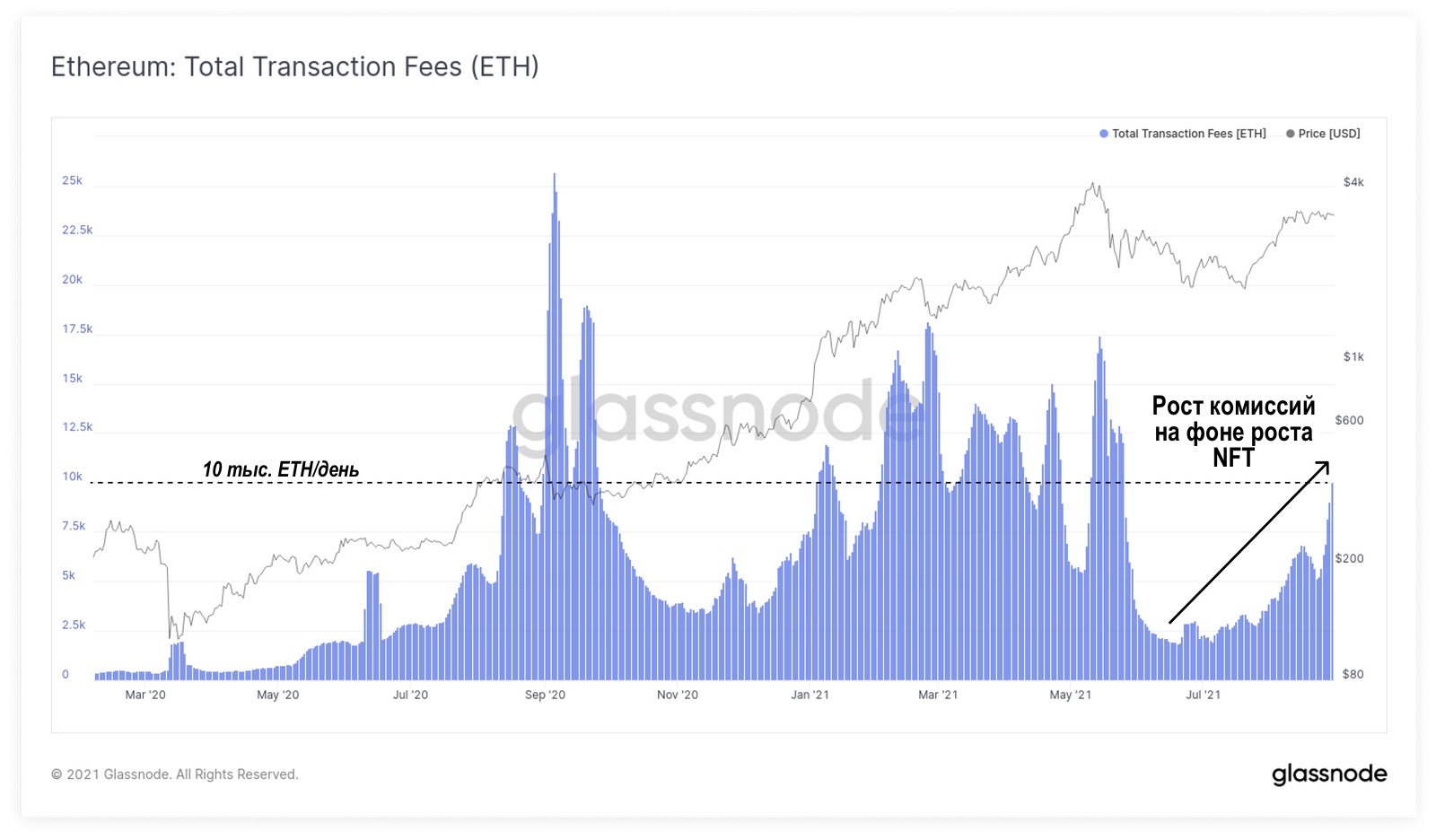 Общий объем взимаемых комиссий в Ethereum на сегодня составляет около 10 тыс. ETH/сутки — довольно высокий уровень, сопоставимый с «летом DeFi» и бычьим ралли 2021 года.