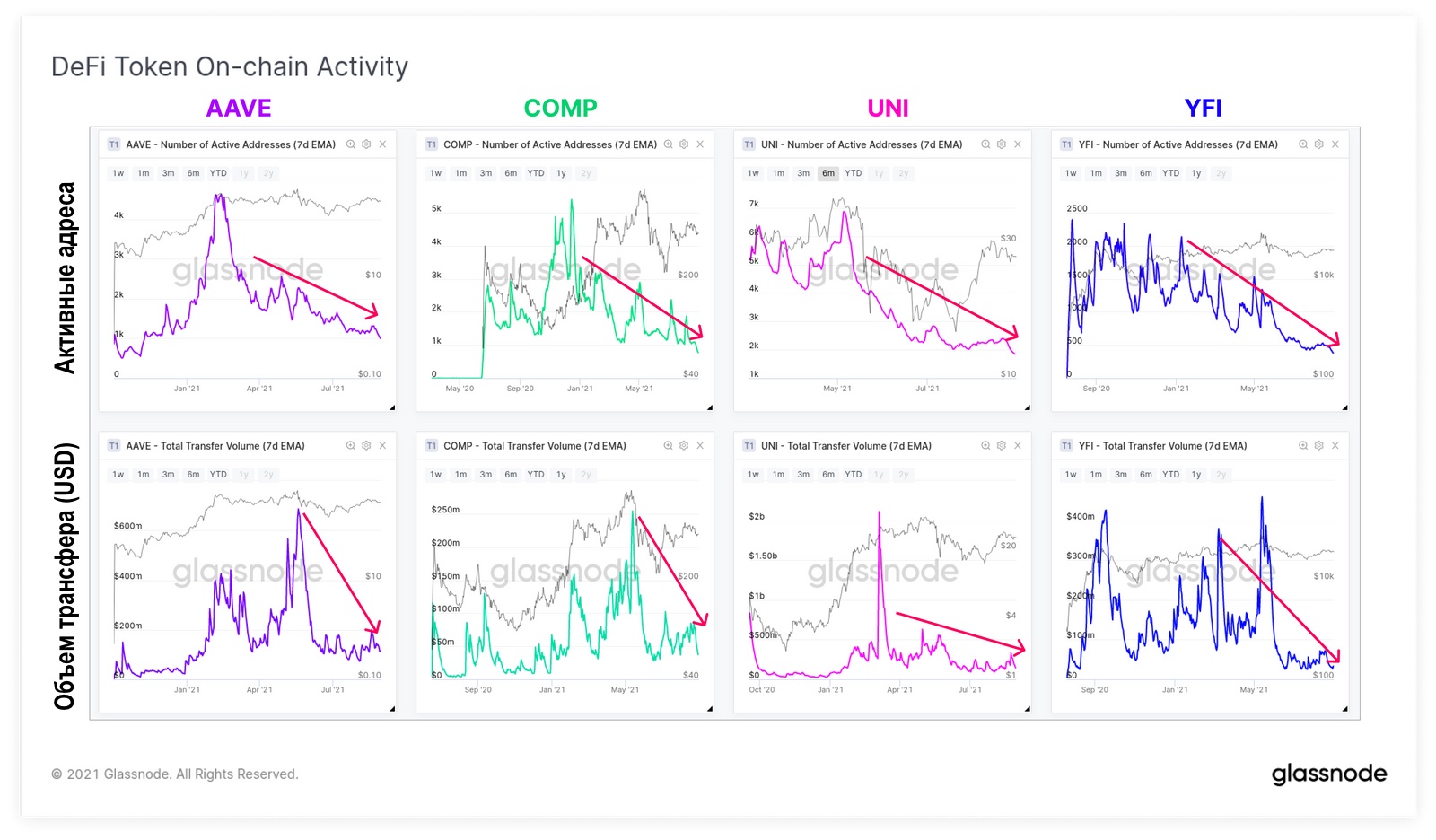 Однако повышенное внимание рынка к NFT имеет свою цену, и DeFi-токены оказались проигравшими в этом уравнении. На графике ниже приведены данные об ончейн-транзакциях для четырех «голубых фишек» DeFi-рынка, токенов AAVE, COMP, UNI и YFI. В верхнем ряду представлены графики числа активных адресов, взаимодействующих с токенами, а в нижнем — общей долларовой стоимости транзакций в соответствующих токенах.