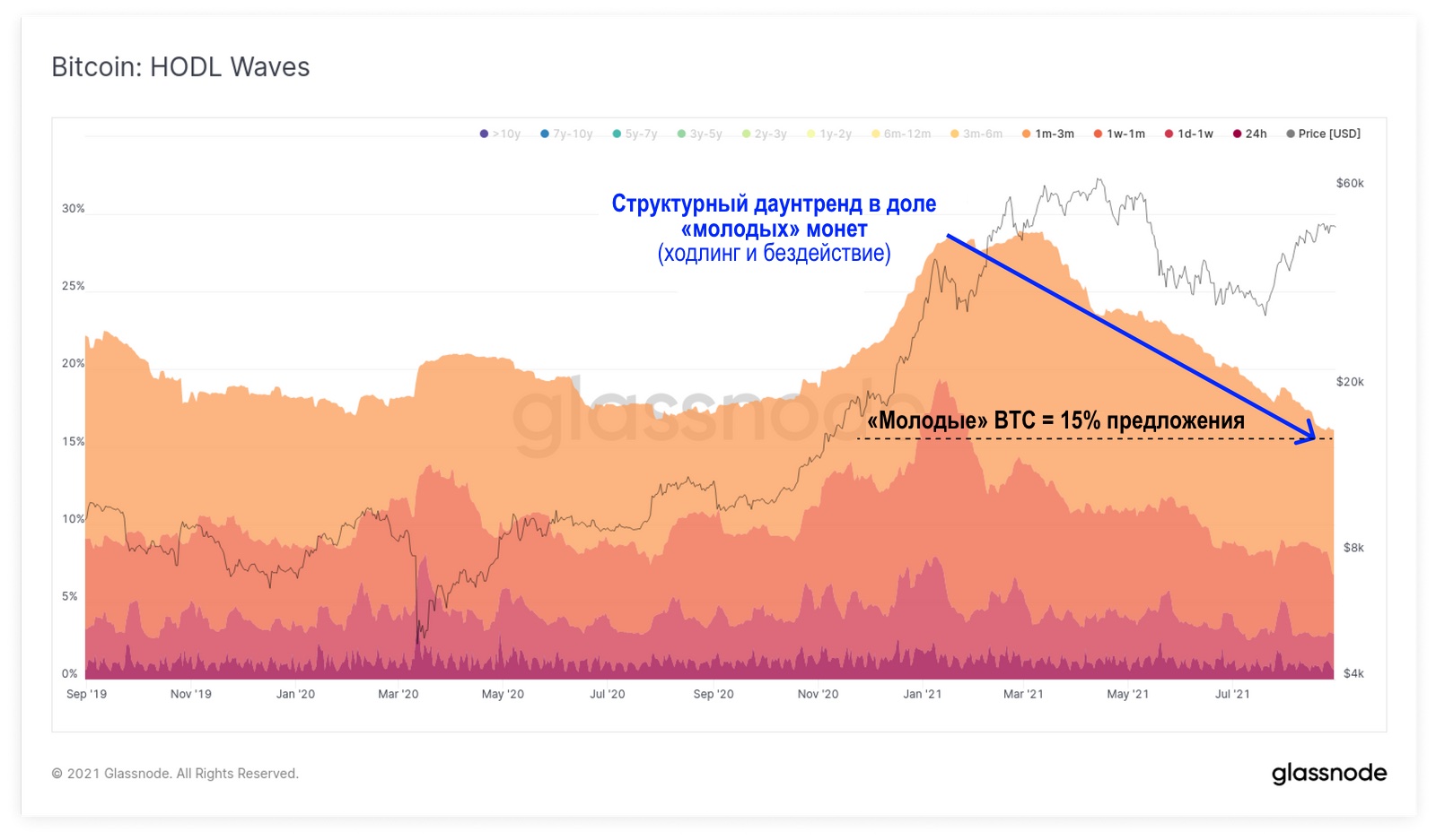 «Молодыми» считаются монеты с возрастом меньше 3 месяцев. Они с наибольшей вероятностью будут потрачены в случае нисходящей волатильности. Снижение доли молодых монет в HODL-волнах указывает на то, что рынок в среднем предпочитает удерживать активы, а не тратить их. Молодые BTC составляют всего 15% от циркулирующего предложения и в этом показателе наблюдается очень сильный нисходящий тренд.