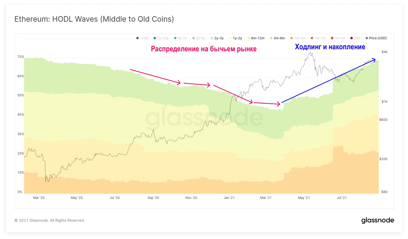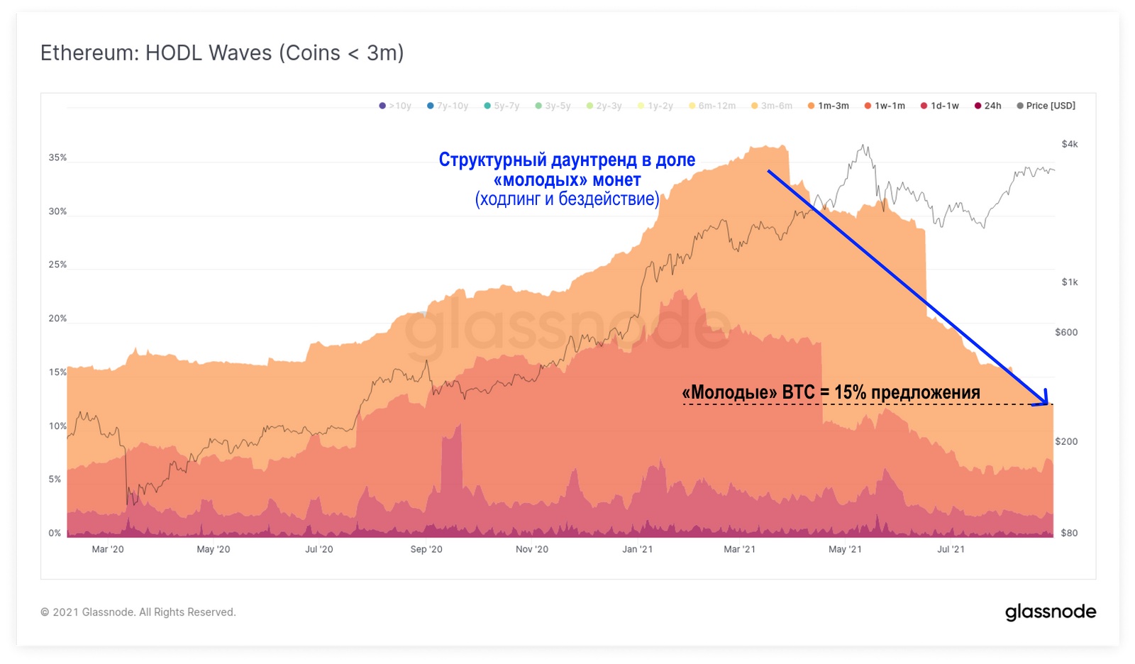График HODL-волн для Ethereum выглядит почти идентично: доля молодых монет снижается до долгосрочного минимума в 12,5% циркулирующего предложения.