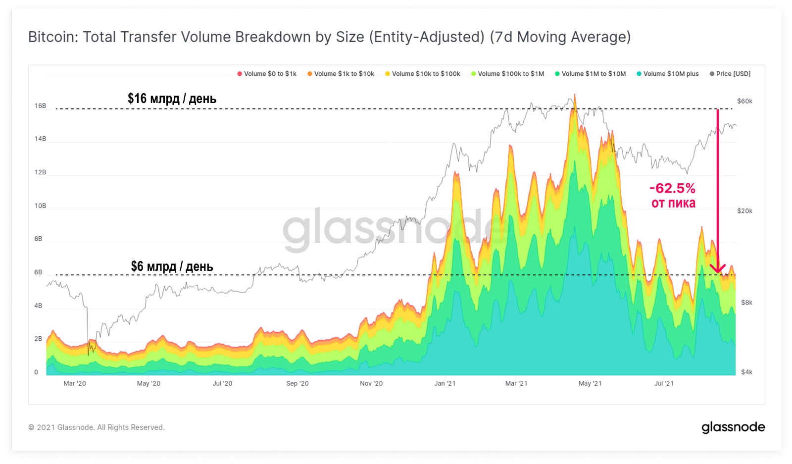 Еще более драматичное снижение можно наблюдать в объеме ончейн-транзакций в долларовом выражении, сократившемся на 62,5% от апрельских максимумов: до $6 млрд в сутки. Обратите внимание, что в отношении и количества транзакций (выше), и их долларового объема (ниже), мы используем скорректированные по пользователям данные, в которых отфильтровываются внутренние переводы между адресами одного субъекта сети. То есть эти данные отражают величину экономически значимого объема.