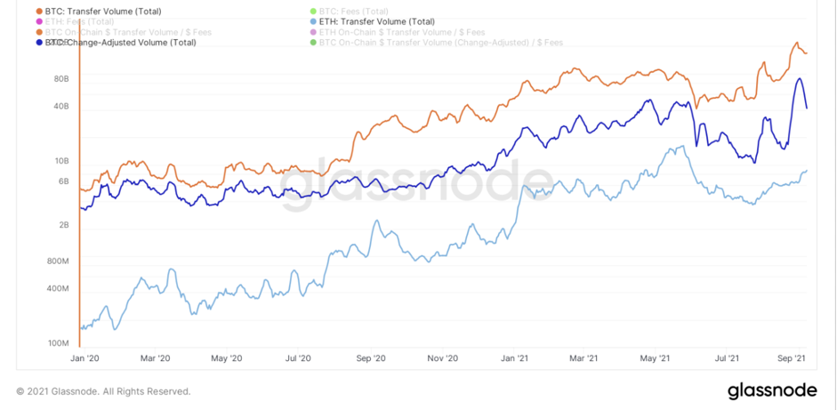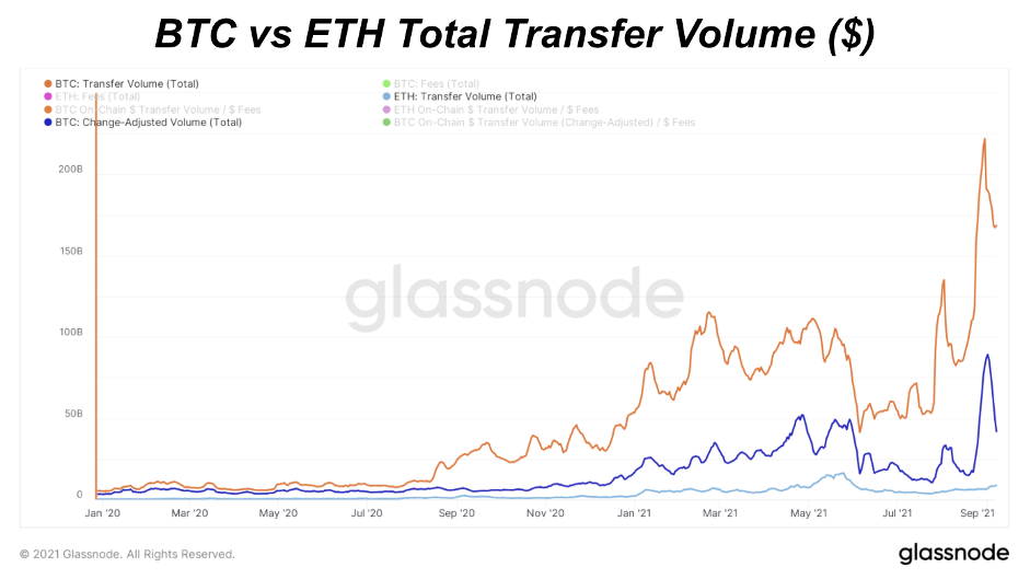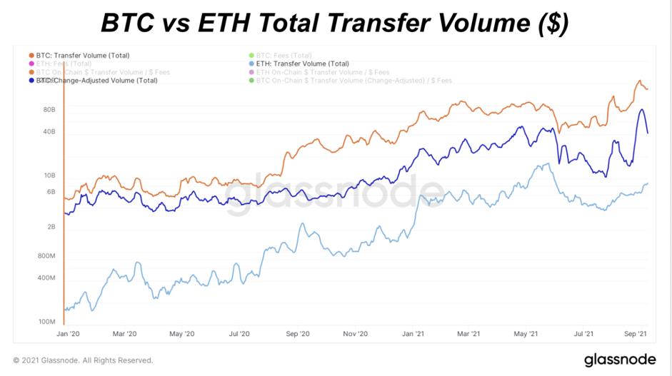 Если посмотреть на общий объём переводов в базовом уровне сетей Биткойн и Эфириум, то средние недельные объёмы переводов выглядят следующим образом: